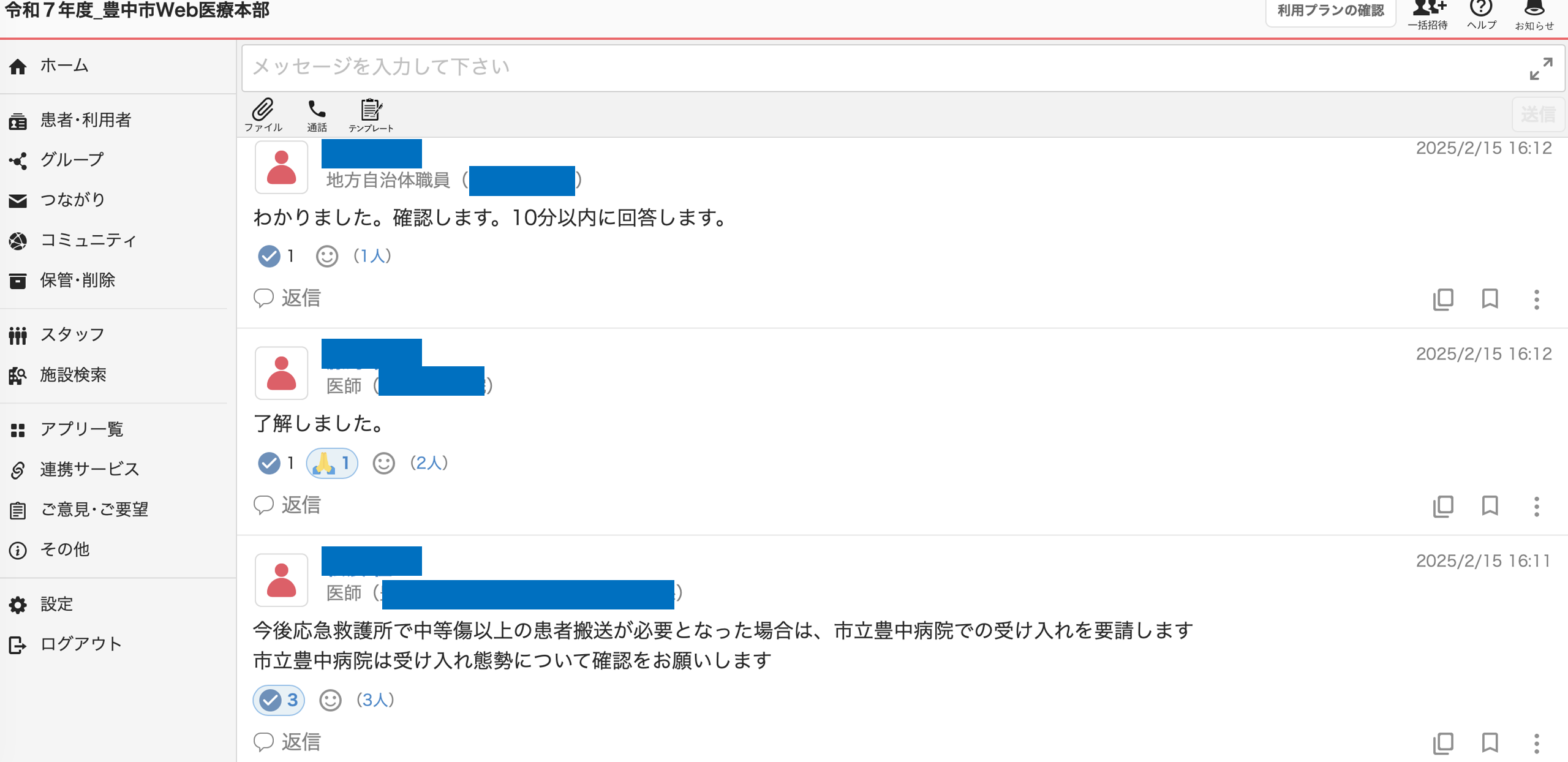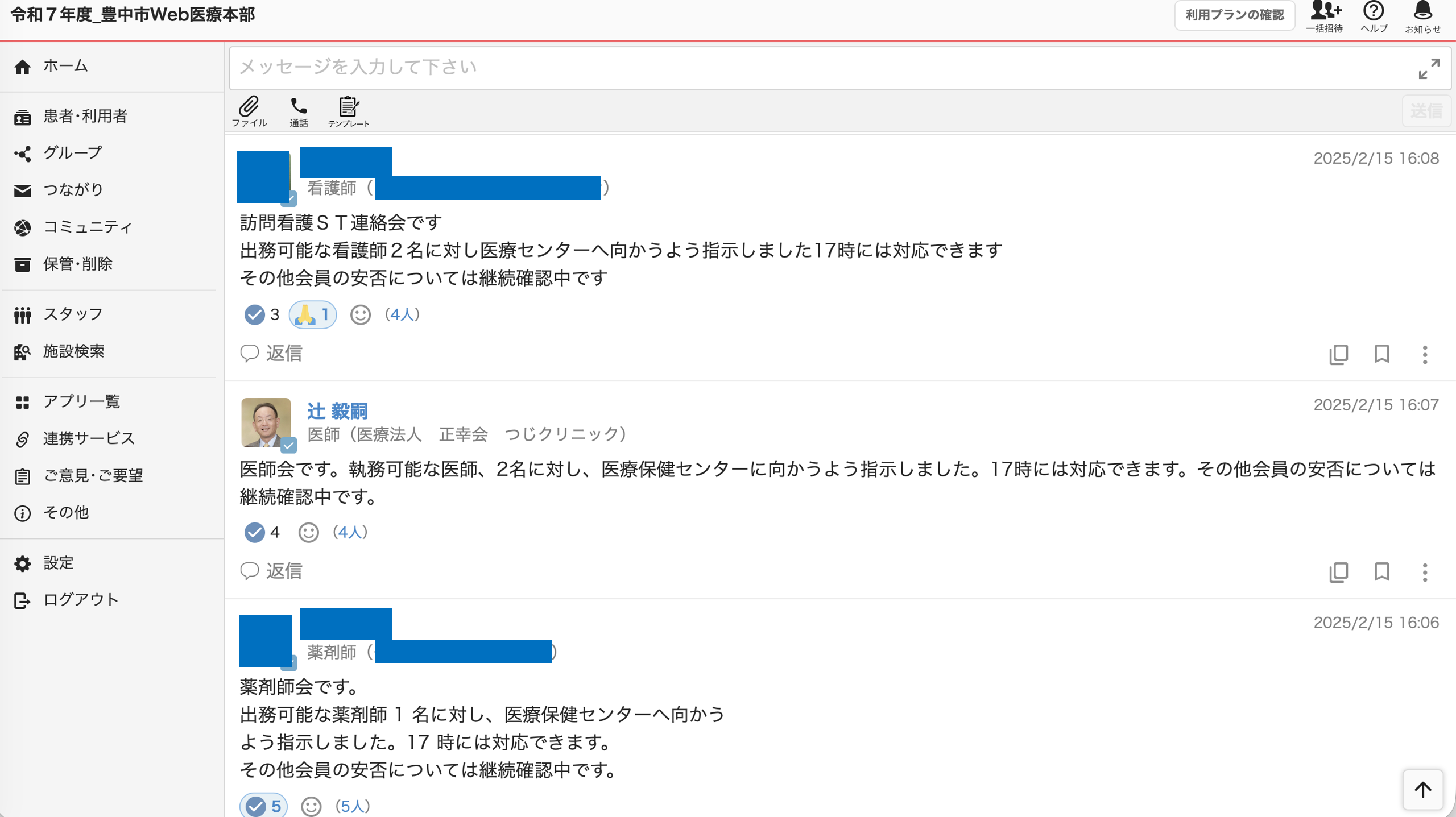まずは「平時にできないことは、有事には絶対にできない」ということです。現在豊中市では、患者グループが5,600件超、自由グループも1,000件を超えています。特に「自由グループ」は医師会の理事や会員全体のグループはもちろん、多職種連携グループや訪問看護ステーション同士の連携など、本当に多様なグループでの連携が自発的に生まれています。日頃から利用して便利さを実感し、自分たちのツールとして愛着を持って使いこなしておく、これに尽きます。