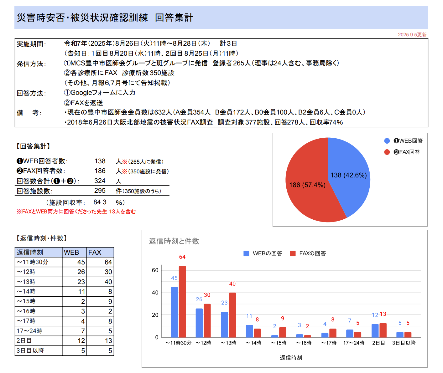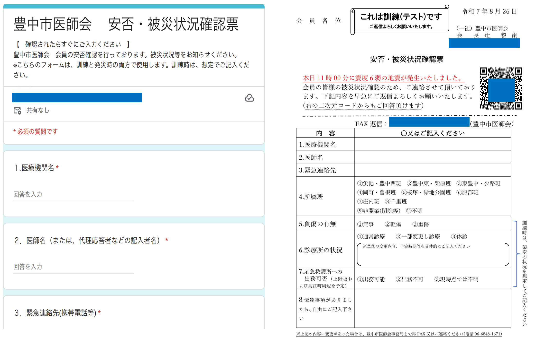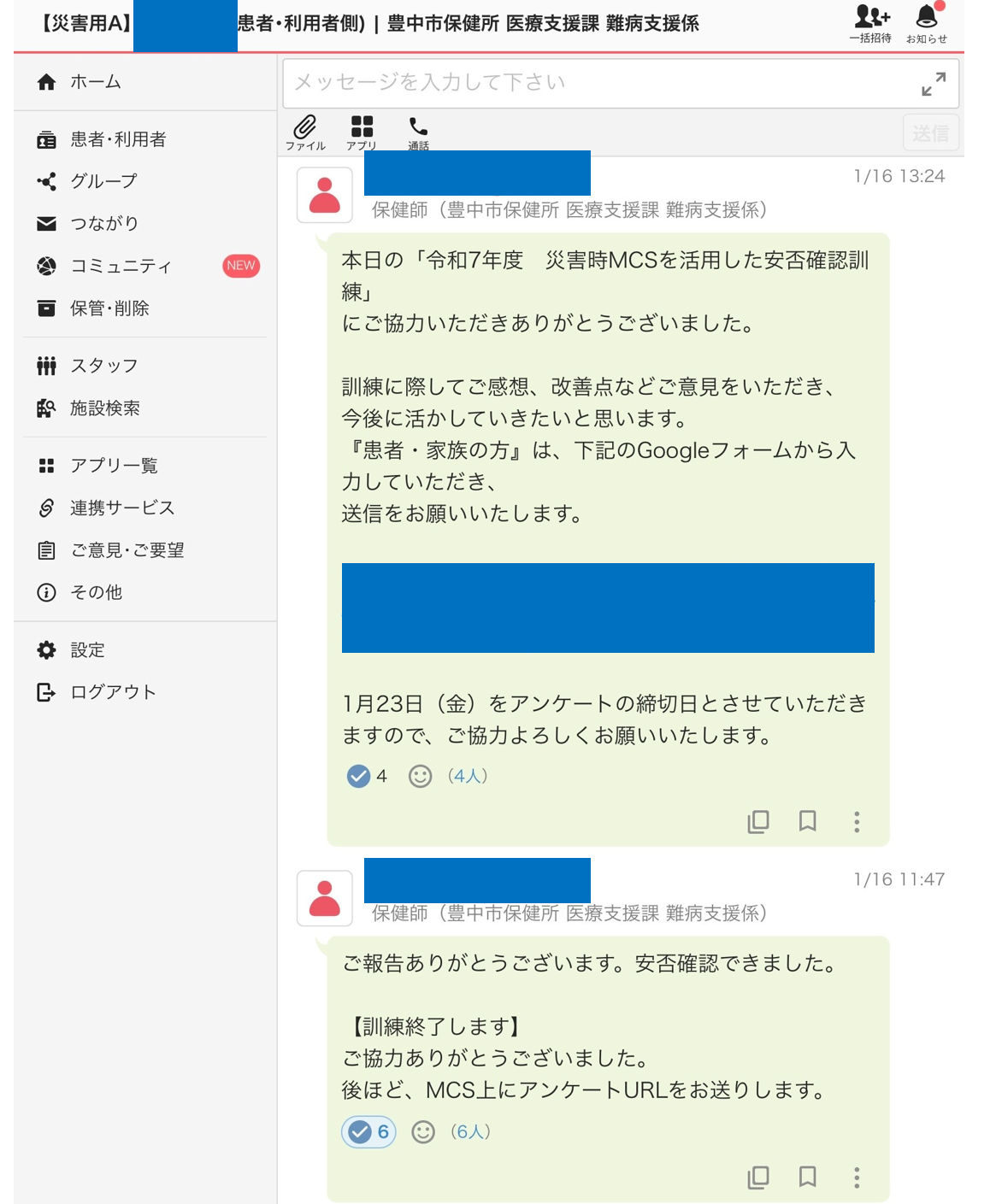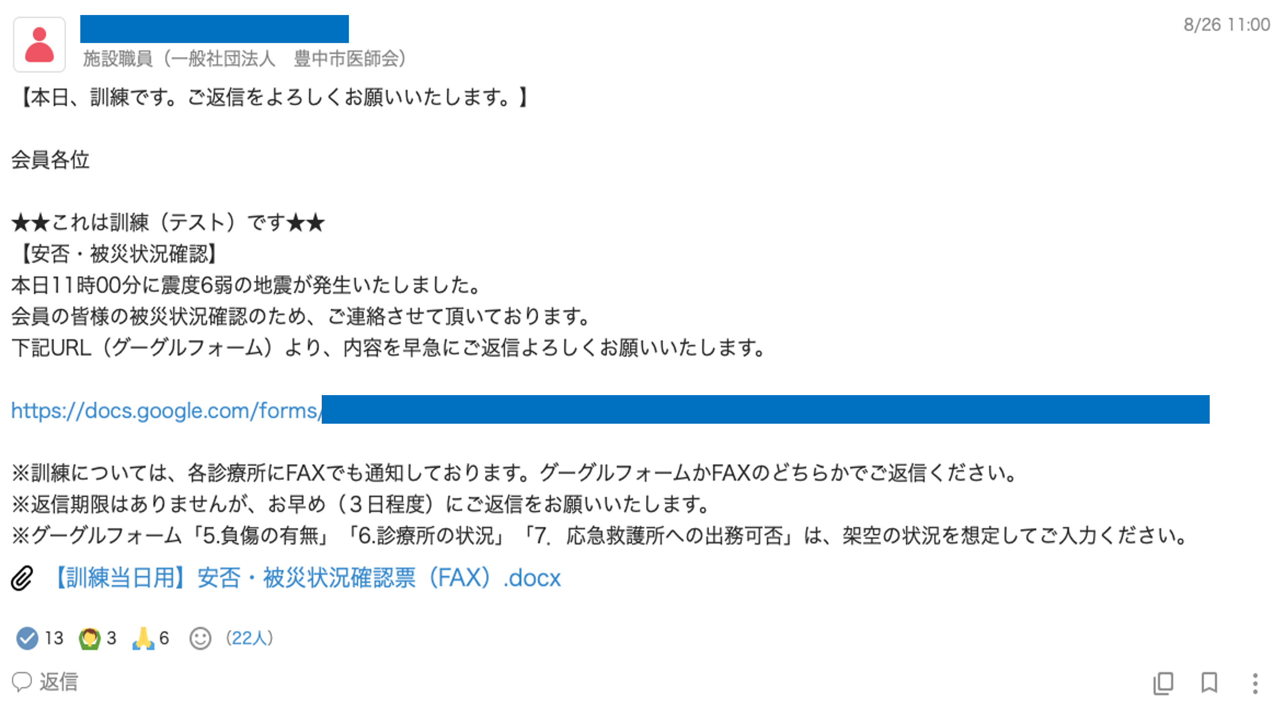 地域の各医療機関が、災害時にどれだけ通常通り診療を継続できているかを正確に把握するための手段として、GoogleフォームとFAXを併用した安否確認を行っています。 単なる個人の無事確認ではなく、医療機関としての「機能維持」を可視化することを目的としており、GoogleフォームのURLをMCSのグループで共有しています。2025年8月安否確認訓練を行ったのですが、回答率85%のうち約4割がMCSで共有したGoogleフォームでの回答でした。