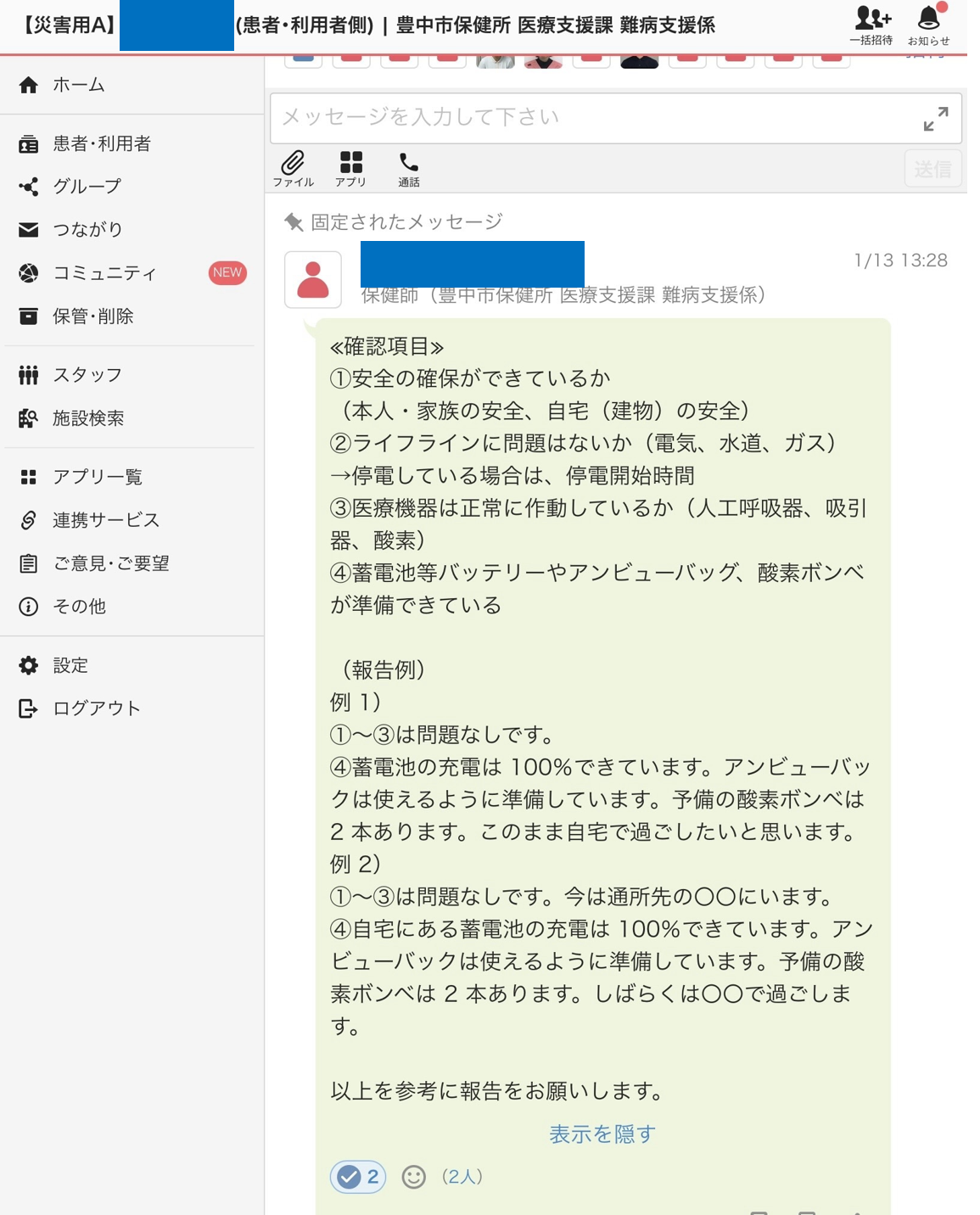 そこで、日々の情報共有用とは別に「災害時専用の患者グループ」を作成して連携をとるようにしました。このグループは保健所の担当者が管理者となり、普段からやり取りしているメンバー、患者さんのご家族、そして基幹病院の地域連携室が参加しています。 行政が日々の情報共有用のグループに入ることには抵抗感があるご家族もいらっしゃいますが、「災害時専用」と切り分けることでスムーズに受け入れていただけました。このグループは訓練でも活用するため、災害が起きてから作るのではなく、日常の部屋を作るのと同時に立ち上げておくのが鉄則です。電話やFAXが主だった病院との連絡も、今では台風接近前に「いつ入院するか」「停電対策はどうするか」といった具体的なやり取りがMCSで完結できて非常に便利です。