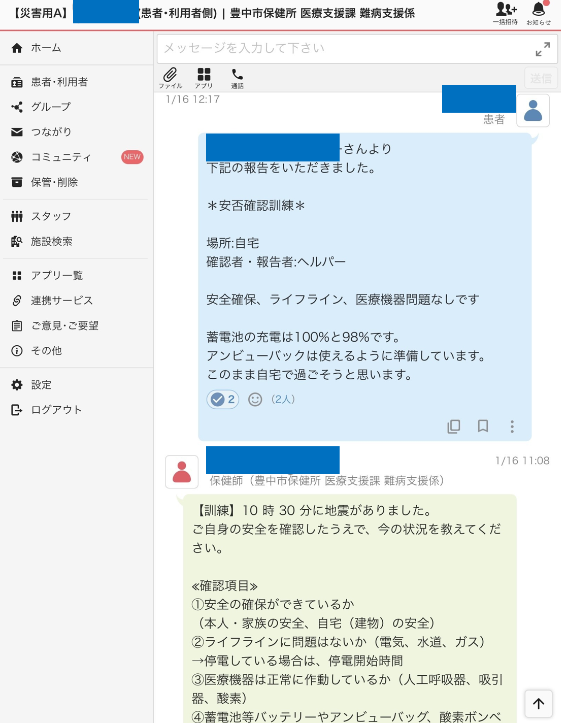 災害時、特にALS(筋萎縮性側索硬化症)などの人工呼吸器を装着されている難病患者さんへの対応は一分一秒を争います。この仕組みを訪問看護ステーションと構築していますが、保健所や基幹病院が加わっていないと、リソースの確保や搬送の調整に遅れが出てしまいます。